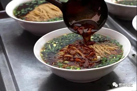 荞面饸饹,是忻县、定襄的小吃之一,制作历史悠久,素负盛名,是二月二和赶庙会时的必尝美食。元代农学家王祯《农书,荞麦》:"北方山后,诸郡多种,治去皮壳,磨而成面或作汤饼。饸饹古称“河漏”或“河捞”,已有600多年历史。主要原料为新鲜荞麦,将精制荞麦粉用温水加熟石灰水(增加筋道)和成面团,取适量的面团放入饸饹床内压入开水锅中,煮熟后捞入温水盆中,食用时加入肉汤、素汤、杂酱等汤料拌食即可。其特点是色黑条细,筋韧爽滑,挑起来不断条,清香利口。冬可热吃,夏可凉吃,有健胃消暑的功效。